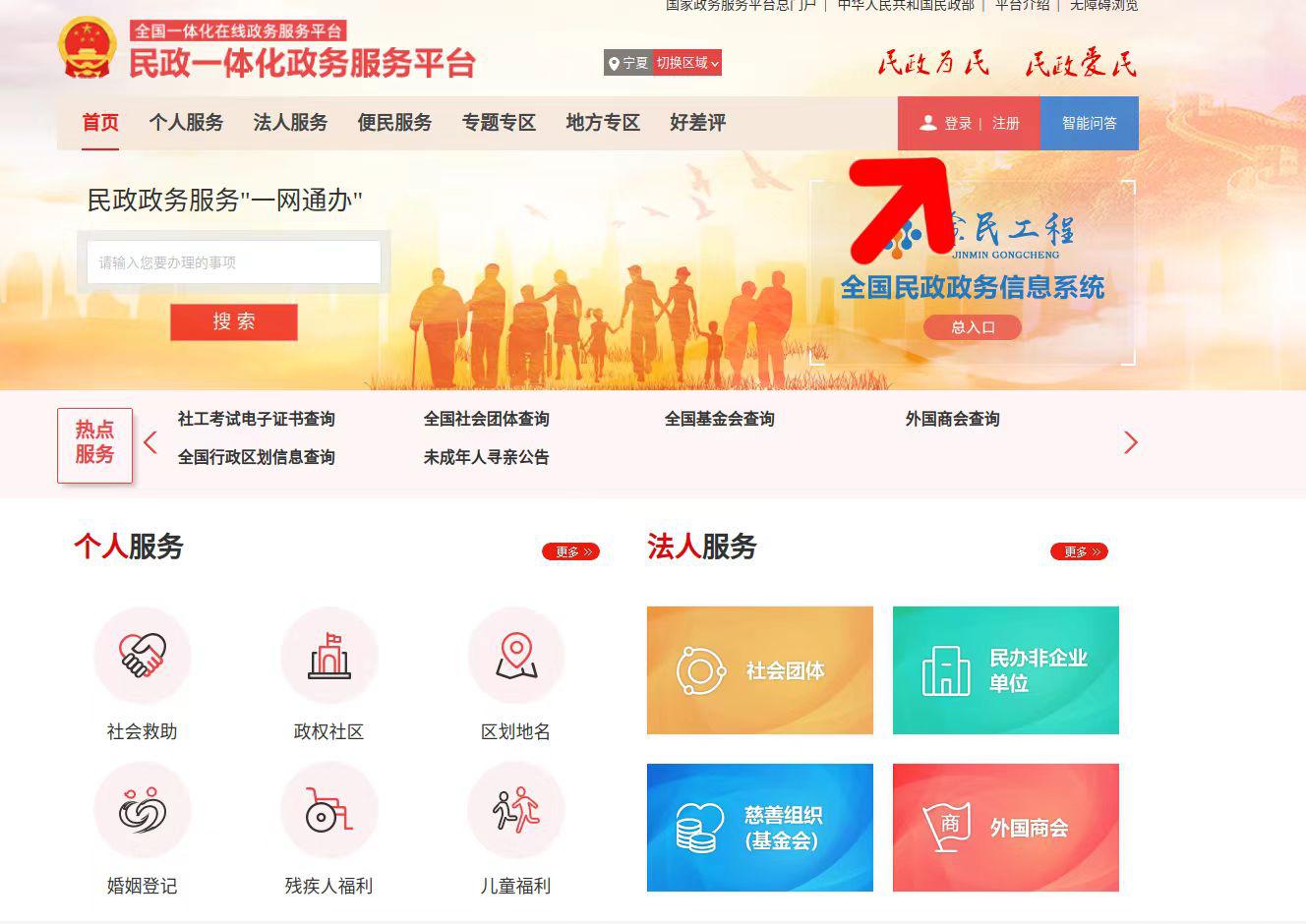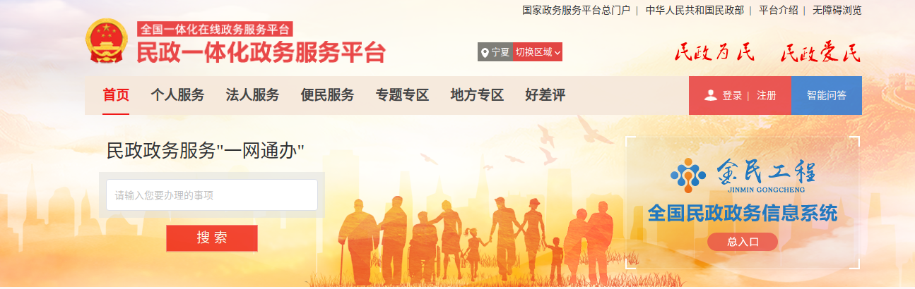 第一步:使用浏览器进入民政一体化政务服务平台(网址://zwfw.mca.gov.cn)。