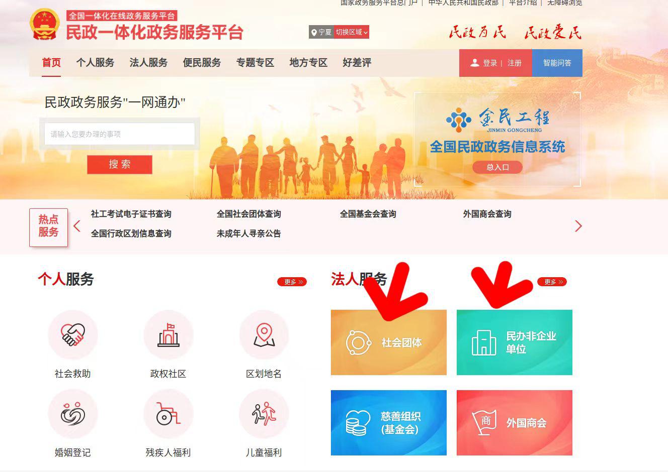 第三步:按照社会组织不同类型,分别选择社会团体、民办非企业单位。