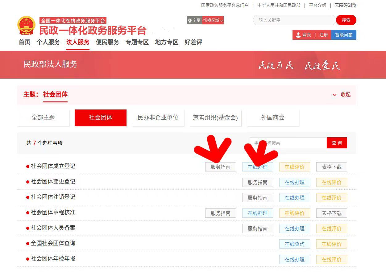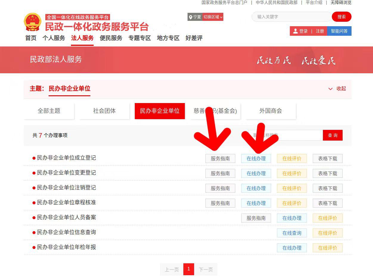 第四步:选择想要办理的相应业务(民非相同),进入填报页面,填报前点击服务指南,并仔细阅读,选择在线办理,按要求填写正确信息。